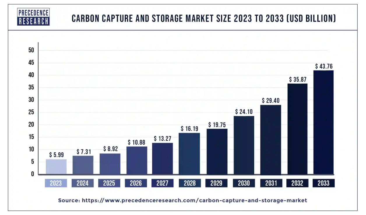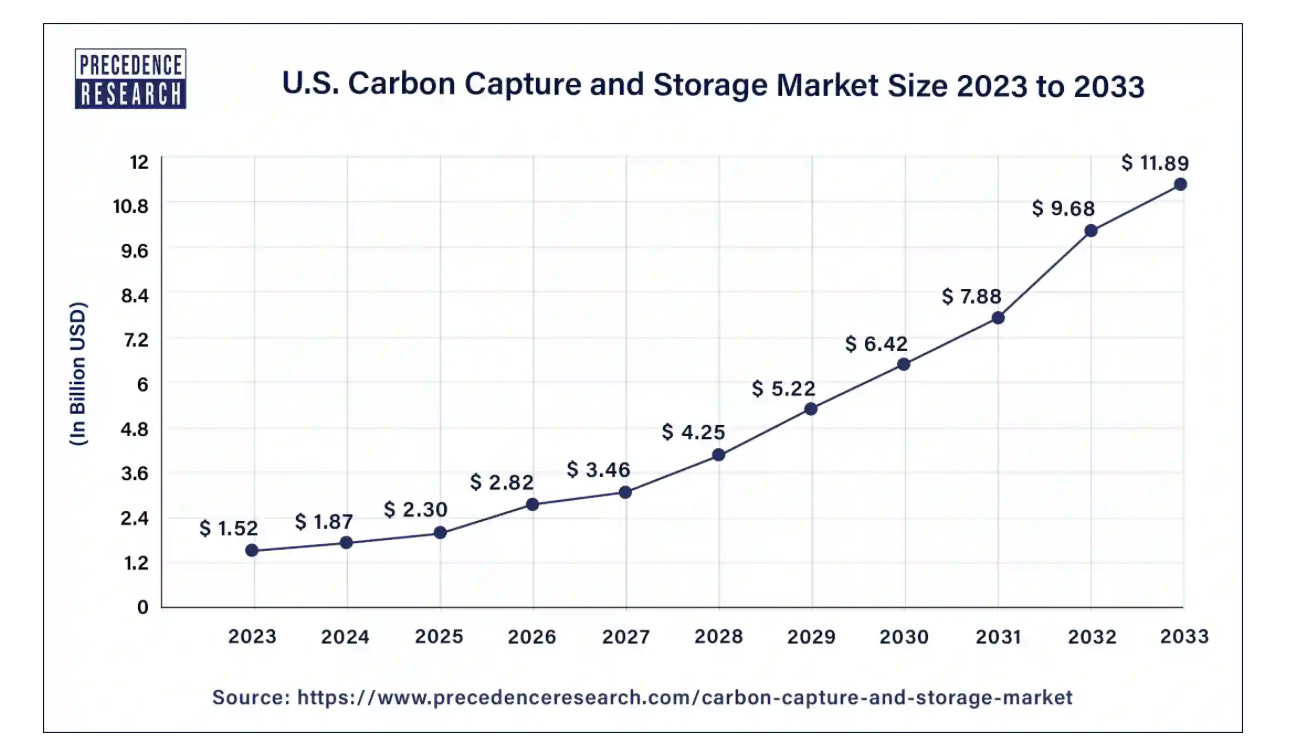 The U.S. carbon capture and storage (CCS) market is poised for rapid growth. Valued at USD 1.52 billion in 2023, the market is projected to reach USD 11.89 billion by 2033, at a compound annual growth rate (CAGR) of 22.8%.