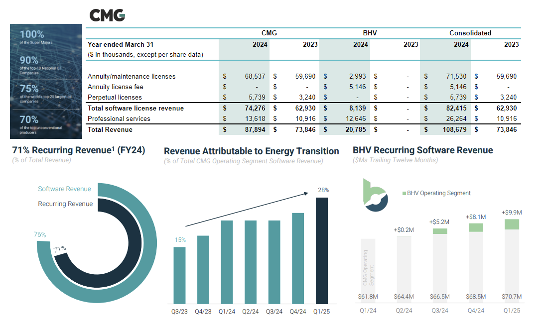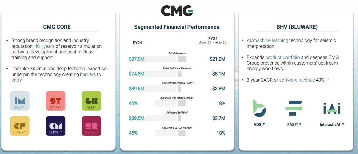 CMG’s reservoir simulation is critical to energy transition initiatives including carbon storage, geothermal and hydrogen. In fiscal 2024, 23% of software revenue in the CMG operating segment came from energy transition.