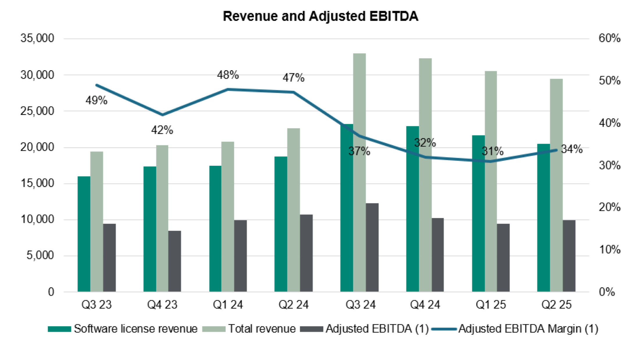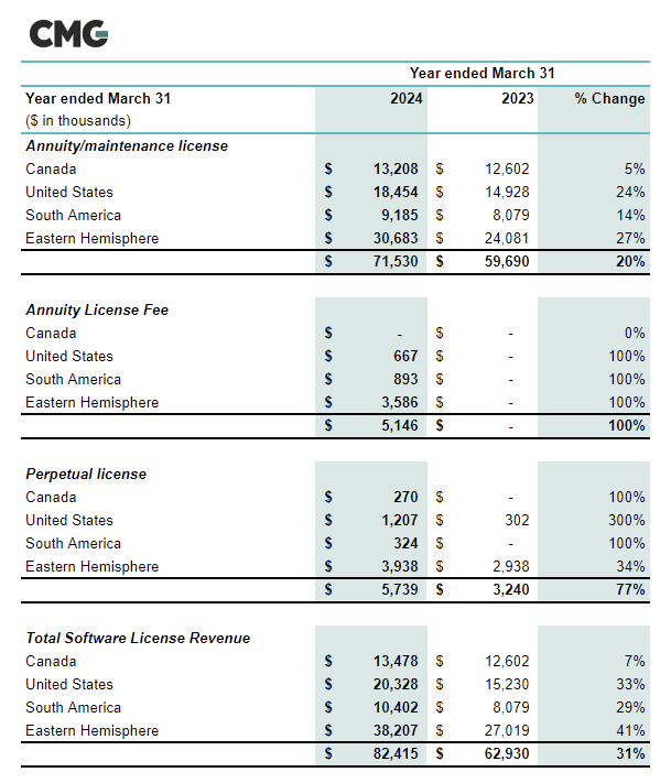 CMG operates in approximately 60 countries, with offices in North America, the UK, the UAE, Colombia, and Malaysia. Some of these countries have higher economic, political, and social risks than North America. As of Q2 fiscal 2025, 39% of software license revenue comes from North America, 11% comes from South America and 49% comes from the Eastern Hemisphere, which includes Europe, Asia, Australia and Africa. Over time, we’d be more comfortable as an investor seeing a higher percentage of revenue coming from North America, which we think would de-risk their current geography split.