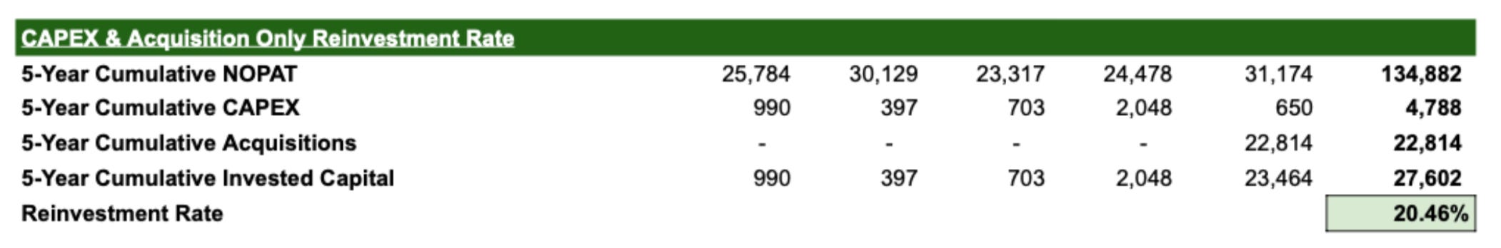 Below is our estimate of net operating profit after tax, ROIC, ROIIC and reinvestment rates.