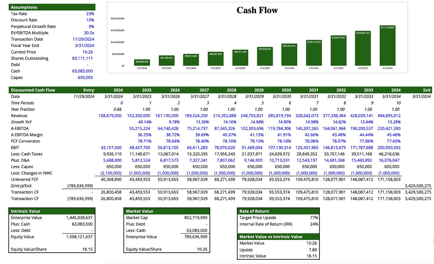 In the fiscal year ended July 31, 2024, Sharp generated approximately €10.0 million (approximately $14.7 million) in revenue, primarily from software sales (over 95% recurring). The company also generated €3.1 million (approximately $4.6 million) in services revenue and achieved a low double-digit Adjusted EBITDA Margin. We believe Sharp’s revenue and adjusted EBITDA can grow by 15-20% over our forecast period, which is reflected in exhibit 28.