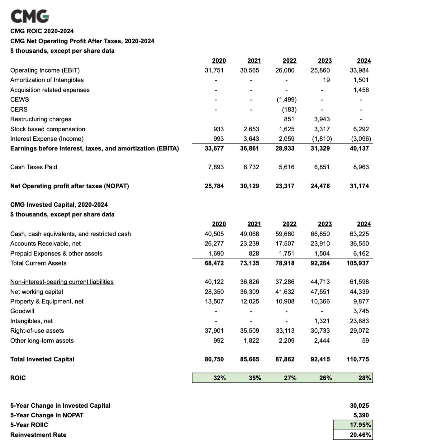 Over the past five years, CMG has generated cumulative diluted earnings of $1.35 per share and reinvested $0.28 per share back into the business to generate effectively no earnings growth per share ($0.32 in FY2024 vs $0.30 in FY2020). Normally, this would be a sign not to invest in a company, however we know this is related to the poor historical capital allocation under old management. With Pramod now CEO of CMG, and a board of directors in place who understand how capital allocation effects stock returns over time, we expect the dividend to be cut and 100% of available free cash flow (maybe even more than 100% if leverage is used) for acquisitions.