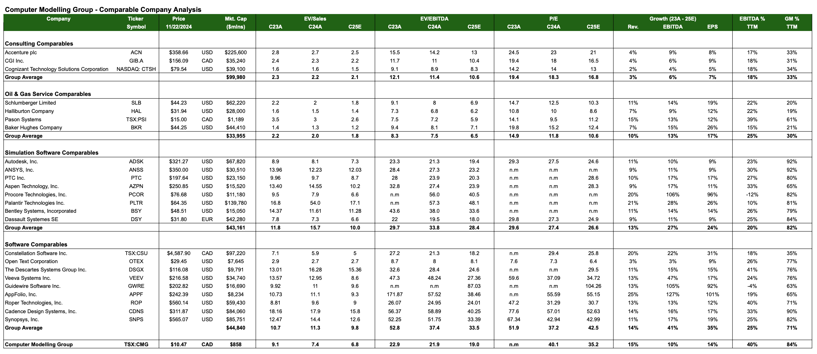 We have an estimated intrinsic value for Computer Modelling Group Ltd. of C$18.15 per share, indicating 77% upside and an IRR of 24%. Our target is based on our 10-year DCF (Exhibit 28). This would also imply 20x C2026E A-EBITDA – in-line with our comparable companies in Exhibit 27. Our DCF analysis assumes: