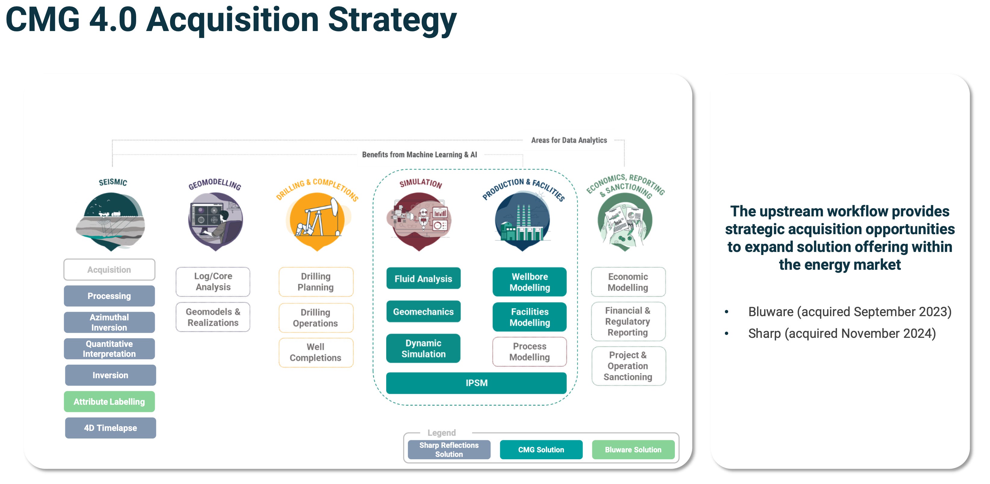 CMG is actively seeking to acquire companies with promising, but under-utilized, proprietary products. The recent acquisition of Bluware, a leader in cloud-based deep learning solutions for subsurface analysis & Sharp Reflections a leading high-performance computing platform for seismic data processing and interpretation serves as a model for future M&A activity. With a substantial portion of the global oil, gas, and chemicals applications market comprised of smaller vendors, there is ample opportunity for CMG to continue expanding its product offerings through strategic acquisitions.