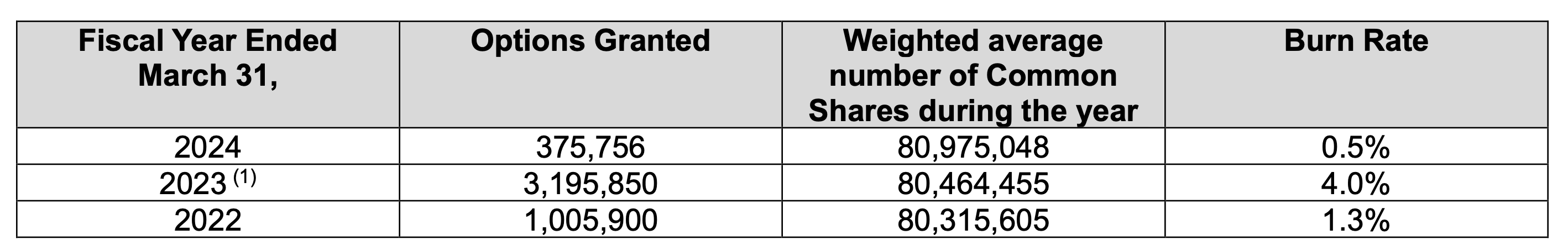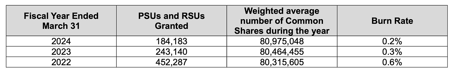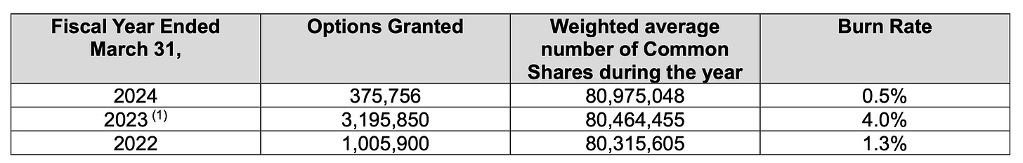 Without the one-time options during fiscal 2023, the normalized burn rate would have been 0.8%. A total of 4,392,173 options were outstanding at March 31, 2024, which represents 5.4% of the issued and outstanding Common Shares. We are very happy to see that stock options will no longer be something to consider as an investor in CMG, eliminating any dilutive effects.