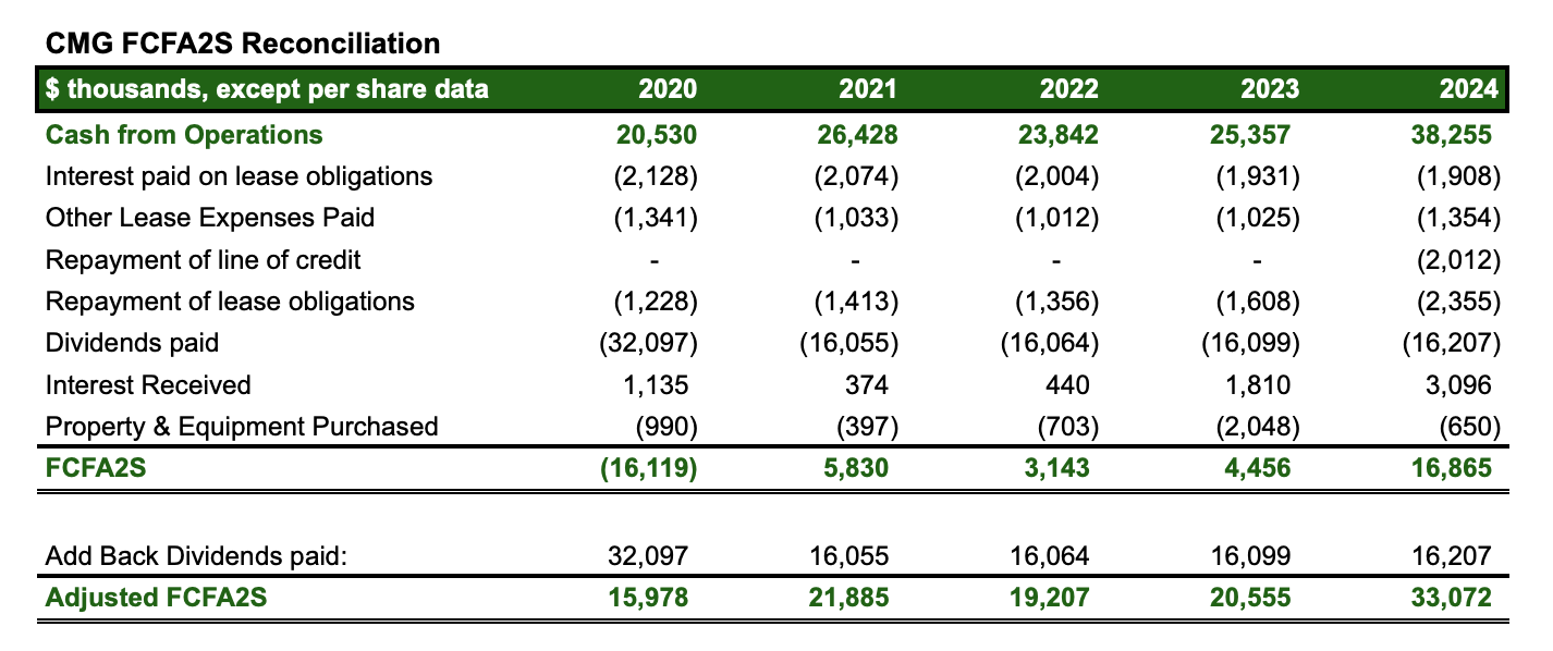 We've presented the historical FCFA2S for the past five years, along with an adjusted version that excludes the impact of the dividend. As you can see, the dividend has been a significant drag on the company's growth. We are optimistic that by discontinuing the dividend, CMG will be able to reinvest these funds and drive substantial growth in the future.