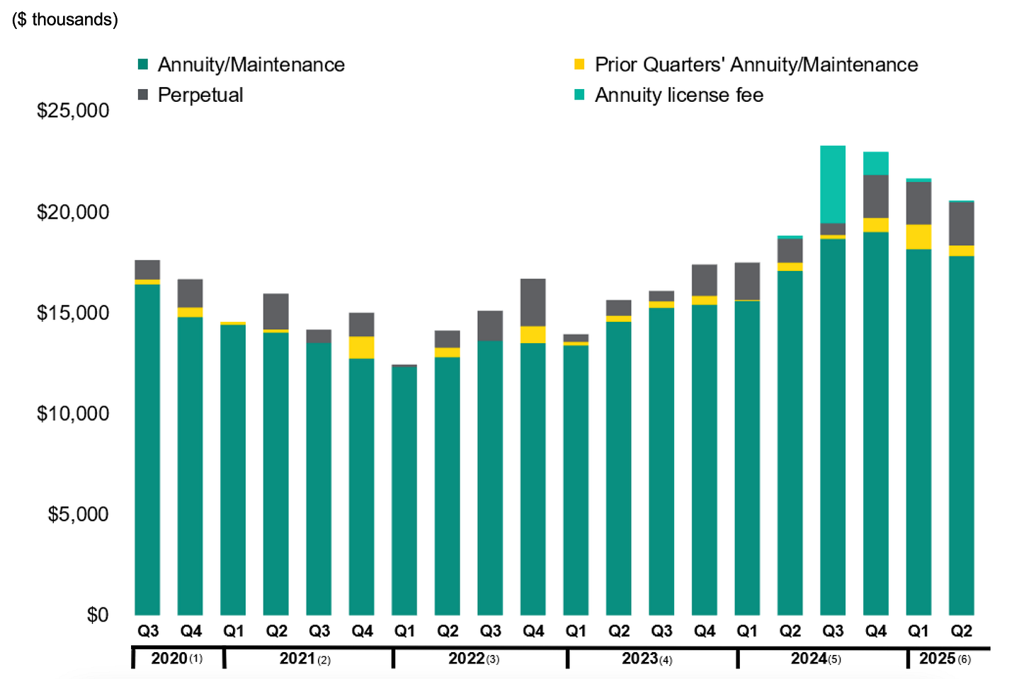 While both annuity/maintenance license revenue and annual license fee represent recurring revenue, the annual license fee revenue is subject to quarterly fluctuations due to agreement renewal timing, which tends to concentrate in the last two quarters of the fiscal year.