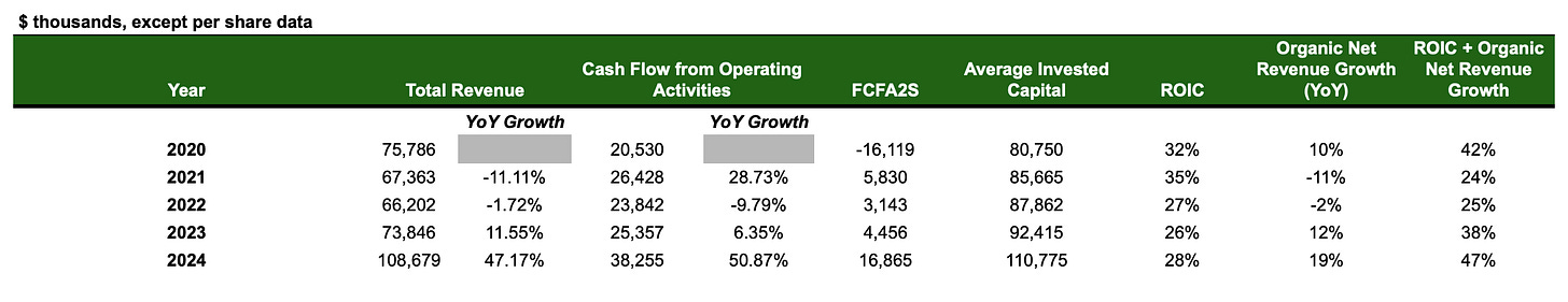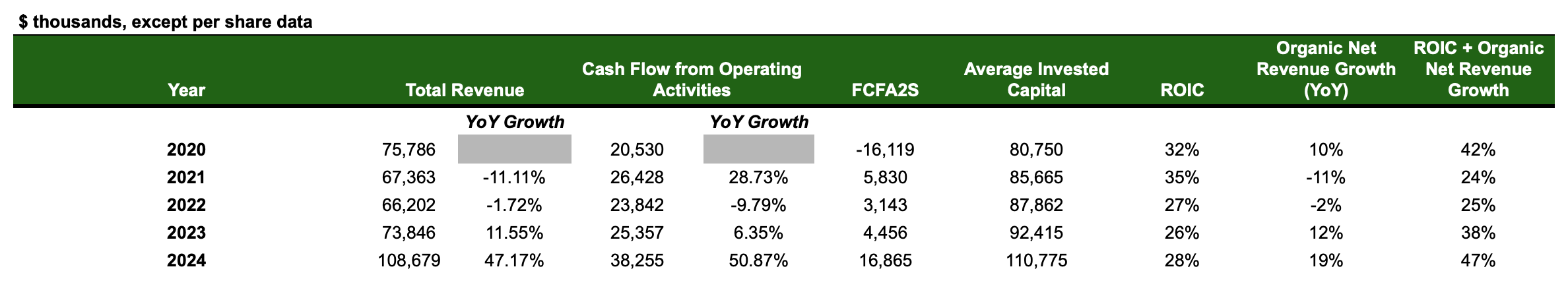 Inspired by Mark Leonard's early approach with Constellation Software, we believe CMG's new 4.0 strategy, under the guidance of its new CEO and board, has the potential to unlock significant shareholder value. By combining Organic Net Revenue Growth with ROIC, we can estimate the annual increase in shareholder value. As CMG shifts its focus to reinvesting a majority of its cash flows back into the business, we anticipate a substantial boost to shareholder returns. If, in the future, CMG is not able to deploy 100% of its free cash flow back into the business and or maintains the drag on FCFA2S with it’s unnecessary dividend, then the two metrics that become most important are free cash flow per share and adjusted net income per share.