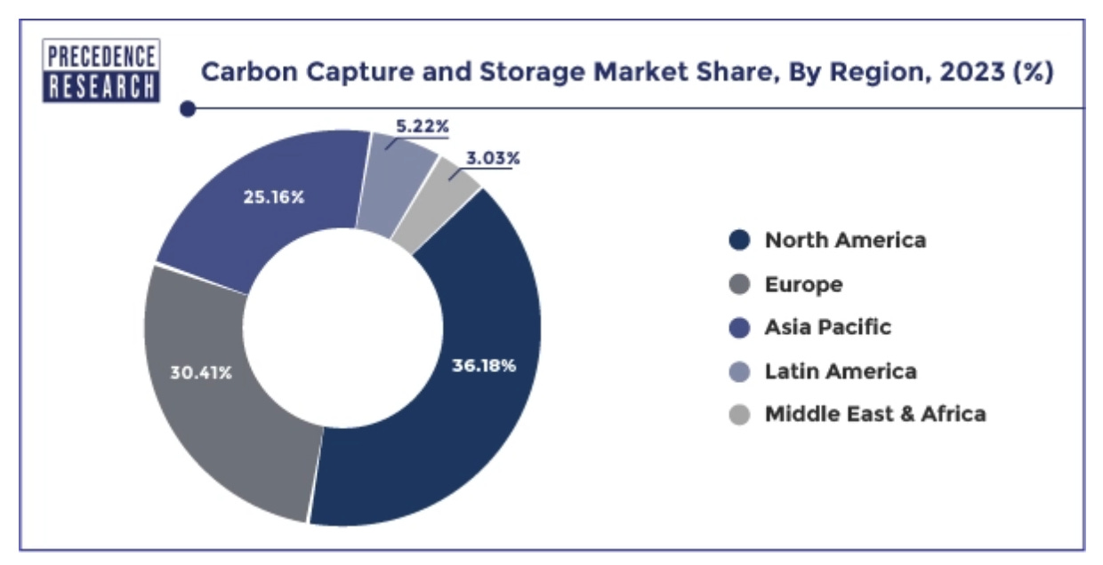In 2023, North America dominated the global carbon capture and storage (CCS) market, accounting for over 36.18% of total sales. This dominance can be attributed to the region's expanding portfolio of existing and planned CCS projects. For instance, in October 2022, Fluor Corporation was awarded a contract to provide engineering services for Project Bison, a large-scale direct air capture (DAC) project in Wyoming, US.