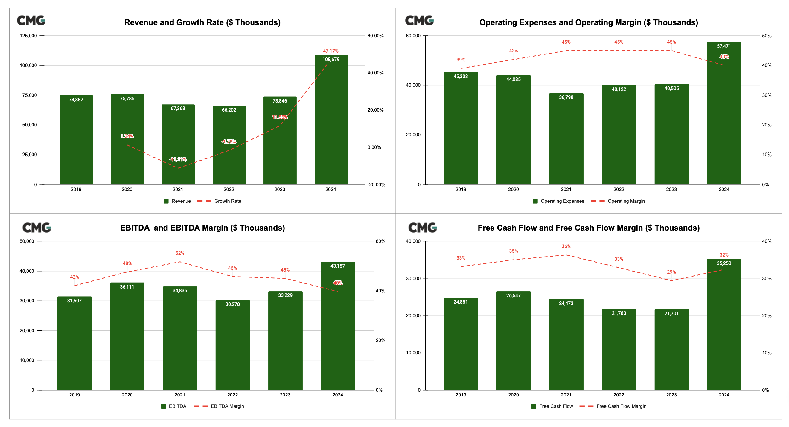In fiscal 2024, CMG experienced significant growth driven by both the BHV acquisition and organic expansion. Total revenue increased by 47% to $108.7 million, with the BHV acquisition contributing 28% and the CMG operating segment contributing 19%. While consolidated adjusted EBITDA margin decreased slightly to 40% due to BHV's lower profit margins, net income grew by 33% and free cash flow by 62%. The company's strong cash position provides flexibility for future acquisitions.