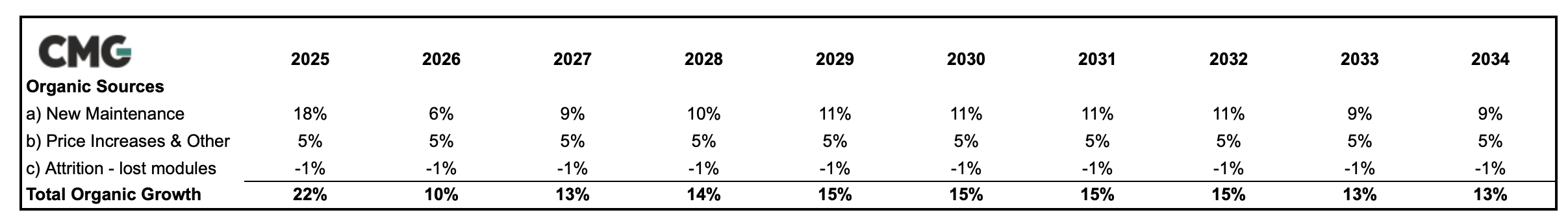 Attrition - Lost Modules & Customers: CMG has stated they have a revenue retention rate of 95% meaning customers are with them for a long time, but we should still expect some negative impact from attrition. we’ll estimate 1-2% negative impact on organic growth yearly.