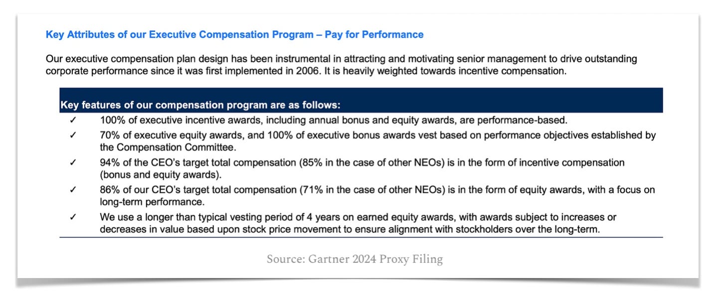 Gartner's leadership is characterized by long-tenured executives. CEO Eugene Hall, in place since 2004, architected the company's 18-year growth strategy. His prior experience includes leadership roles at ADP and McKinsey. During his tenure, Gartner has delivered approximately 20% annualized share and earnings growth, significantly outperforming market benchmarks. Mr. Hall's substantial beneficial ownership (1.7% of outstanding shares, ~$450 million) aligns his interests with shareholders. His contract extends through 2026. Executive compensation is heavily weighted towards long-term incentives tied to CV growth, with base salary and cash bonuses representing a smaller portion.