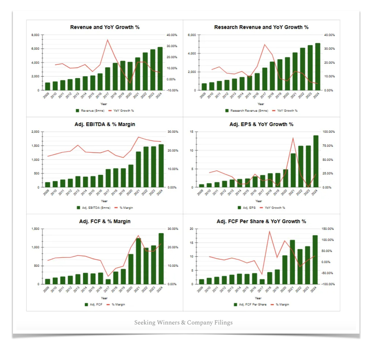 Gartner has demonstrated exceptional and reliable growth, consistently delivering strong double-digit increases in revenue, adjusted EBITDA, adjusted EPS, and free cash flow since 2007, with only two minor revenue declines during major economic downturns in 2009 and 2020.