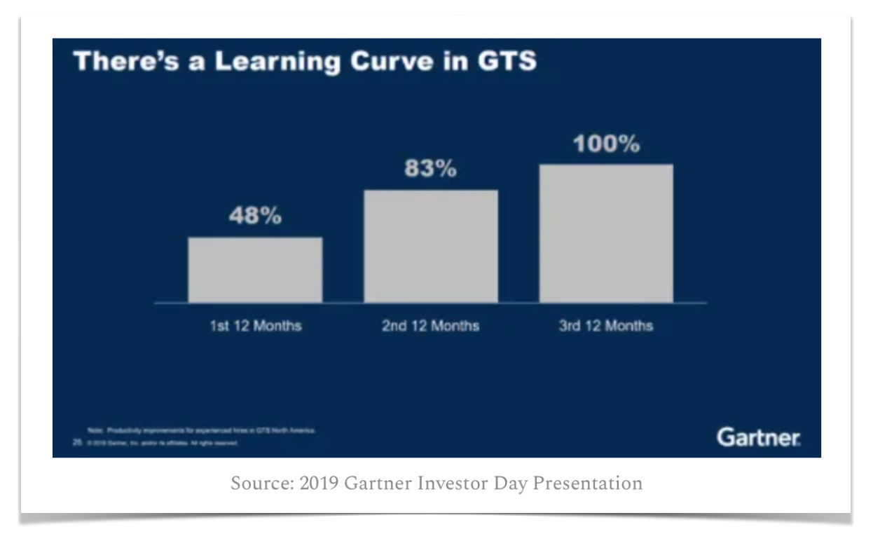While this people-intensive approach currently results in lower EBITDA margins compared to peers such as SPGI, VRSK, MCO, etc., (~20% versus peers north of 40%), we think this shields Gartner from potential disruption as the data they are collecting through interviews is one-of-a-kind. Gartner's growth strategy necessitates a significant investment in human capital, requiring continuous expansion of its analyst workforce and a corresponding increase in general and administrative expenses, particularly in recruitment, which can cause a lag effect in margins temporarily while sales reps reach 100% productivity (again more on this later).