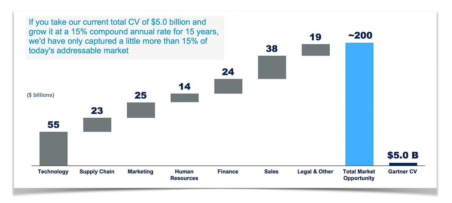 Gartner operates within a vast and significantly under-penetrated market, targeting 150,000 global enterprises with annual revenues exceeding $100 million and technology budgets of $10-50 million. This translates to a $200 billion total addressable market, segmented into $55 billion for technology solutions (GTS) and $145 billion for business solutions (GBS). Current client spending demonstrates substantial room for expansion: GTS clients average $250,000 annually, representing fewer than 0.25% of their sales and only 5 user seats compared to Gartner's recommended 5-10. Similarly, GBS clients average $200,000 annually, supporting just 4 user seats across key business functions, while the potential for penetration across these verticals remains significant. With a historical outreach of roughly 40,000 enterprises, Gartner has achieved a near 50% conversion rate to paying customers, indicating a highly effective sales funnel and strong market demand. This substantial gap between current and potential client spending, combined with the large addressable market, provides a compelling runway for sustained revenue growth.