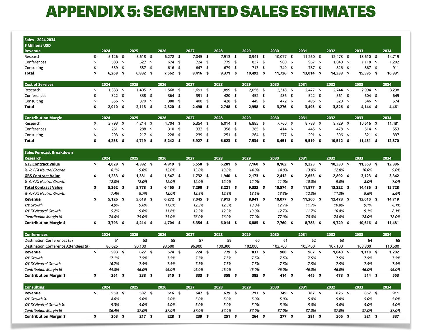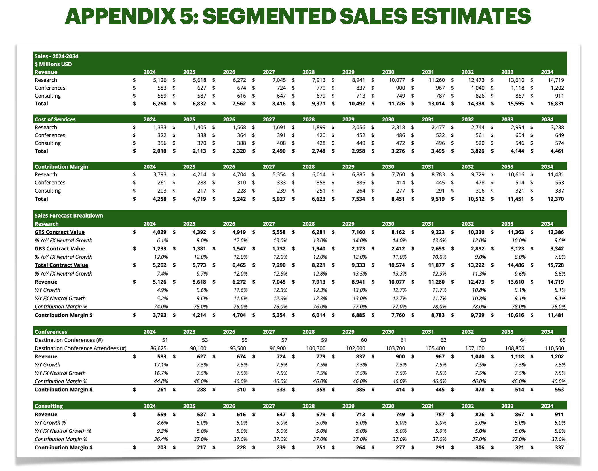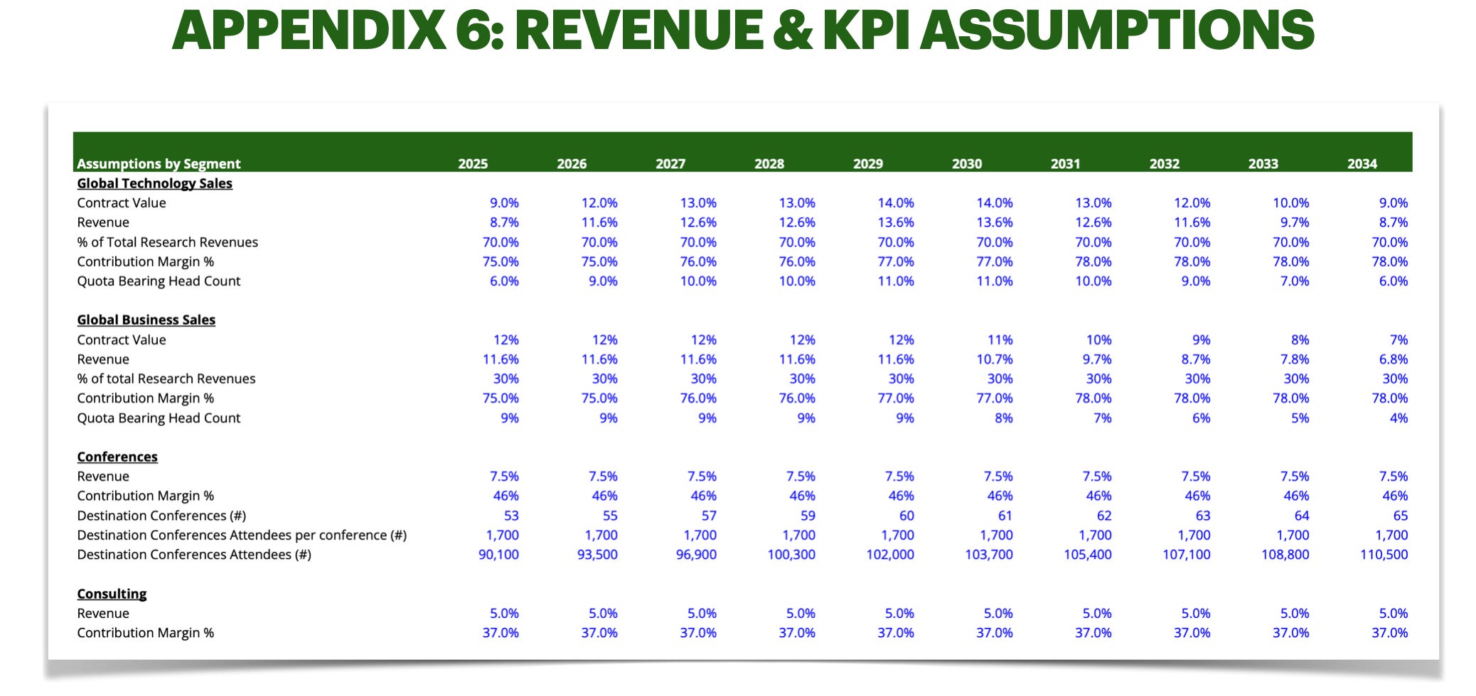 Our model places less emphasis on Conferences and Consulting. We project Conferences revenue to growth at 7.5% annually (55 conferences estimated in 2026). For Consulting, we anticipate 5% growth, aligning with the midpoint of their 3-8% medium-term guidance.