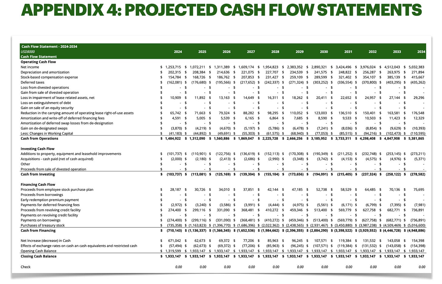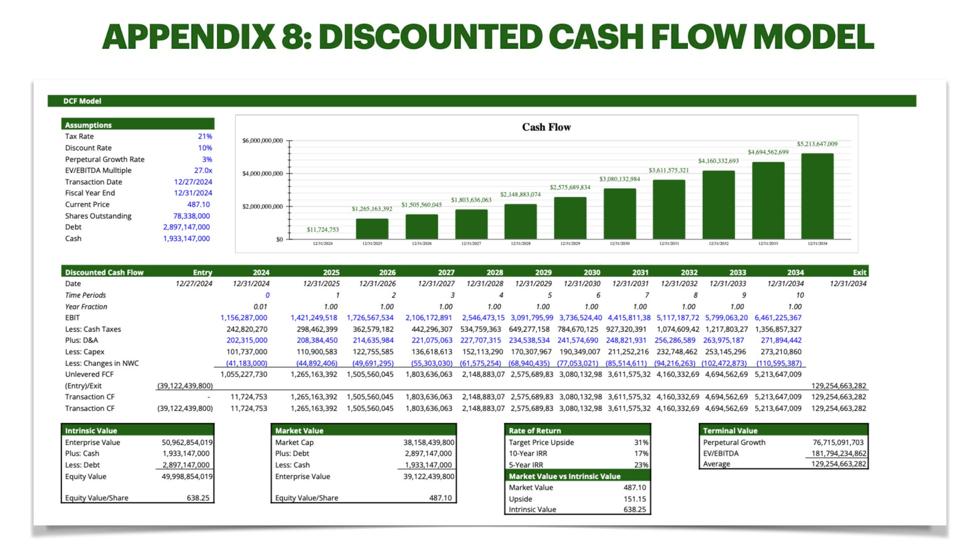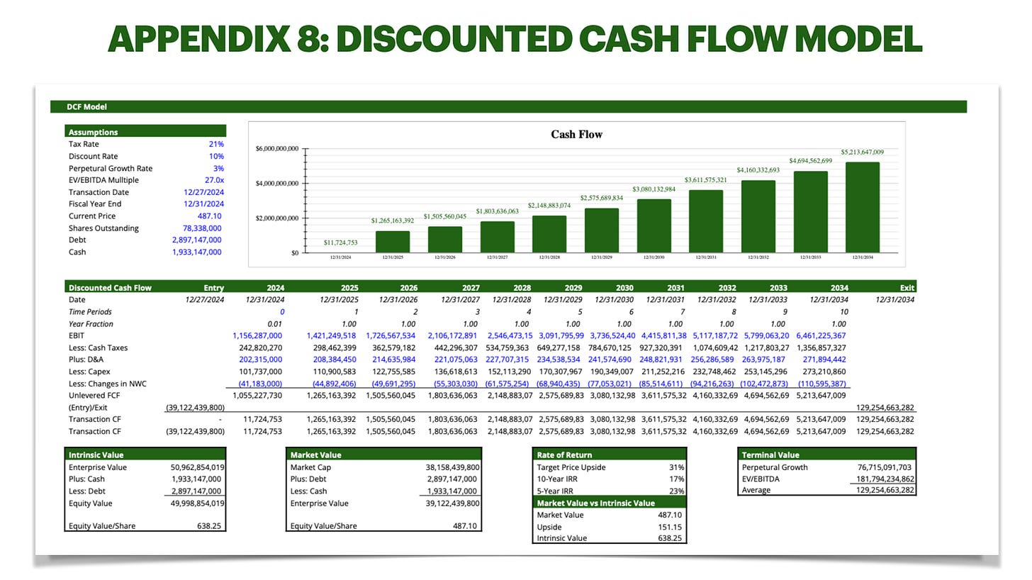 Based on our entry price, our base case model generates a 25% five-year IRR and a 18% ten-year IRR. The 25% IRR target is derived from an estimated share price of $1,053 in 2029 and an “intrinsic value” per share at our entry date of December 27, 2024 of $638.25. These IRR targets are derived from our comprehensive financial statement model (including income statement, balance sheet, and cash flow projections) and a discounted cash flow (DCF) model, which employs a 10% discount rate and the aforementioned 27x exit multiple. Supporting details, including a summary of our DCF analysis, are available in the appendices below.