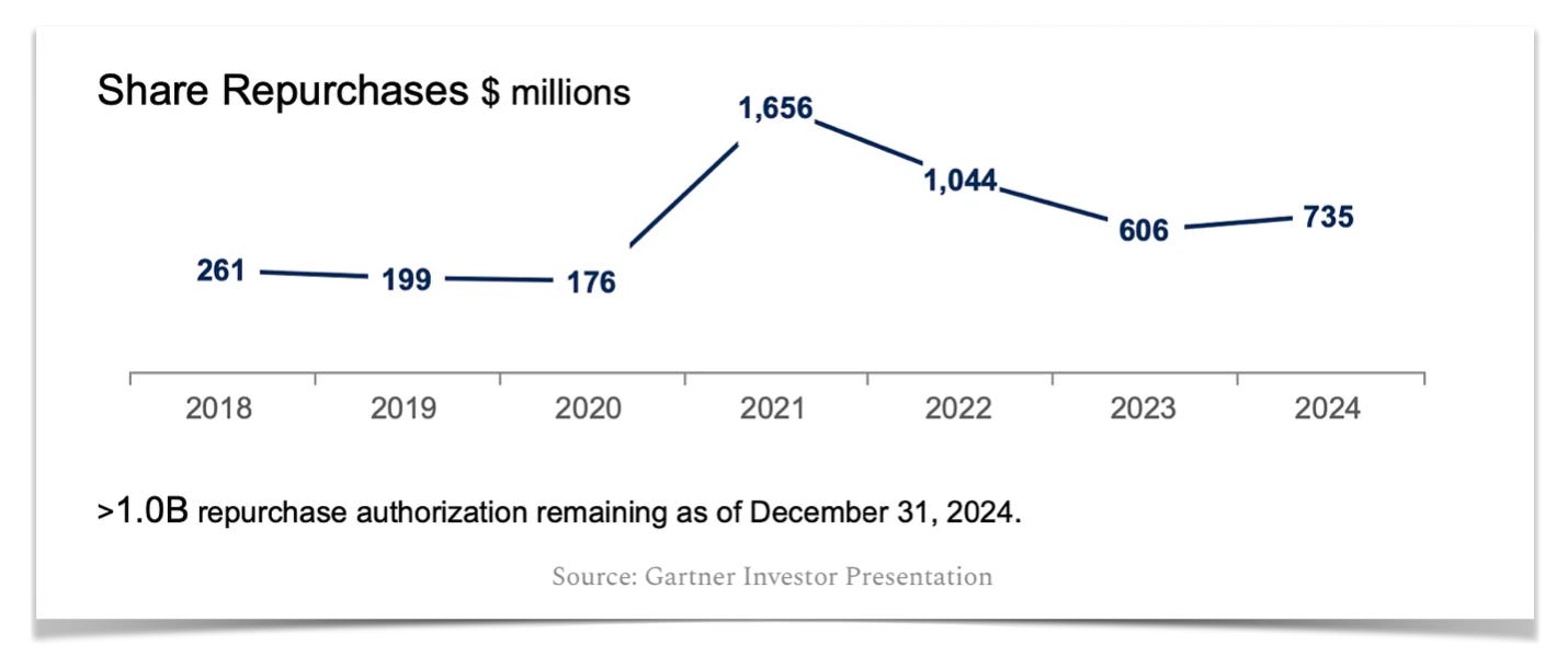 Gartner's historical track record of significant share repurchases, demonstrated below supports this projection. With a net debt of roughly $1billion and a business model that generates substantial FCF, we anticipate Gartner will maintain its focus on share repurchases, enabling a 3-6% annual share reduction without utilizing additional leverage over our forecast period.