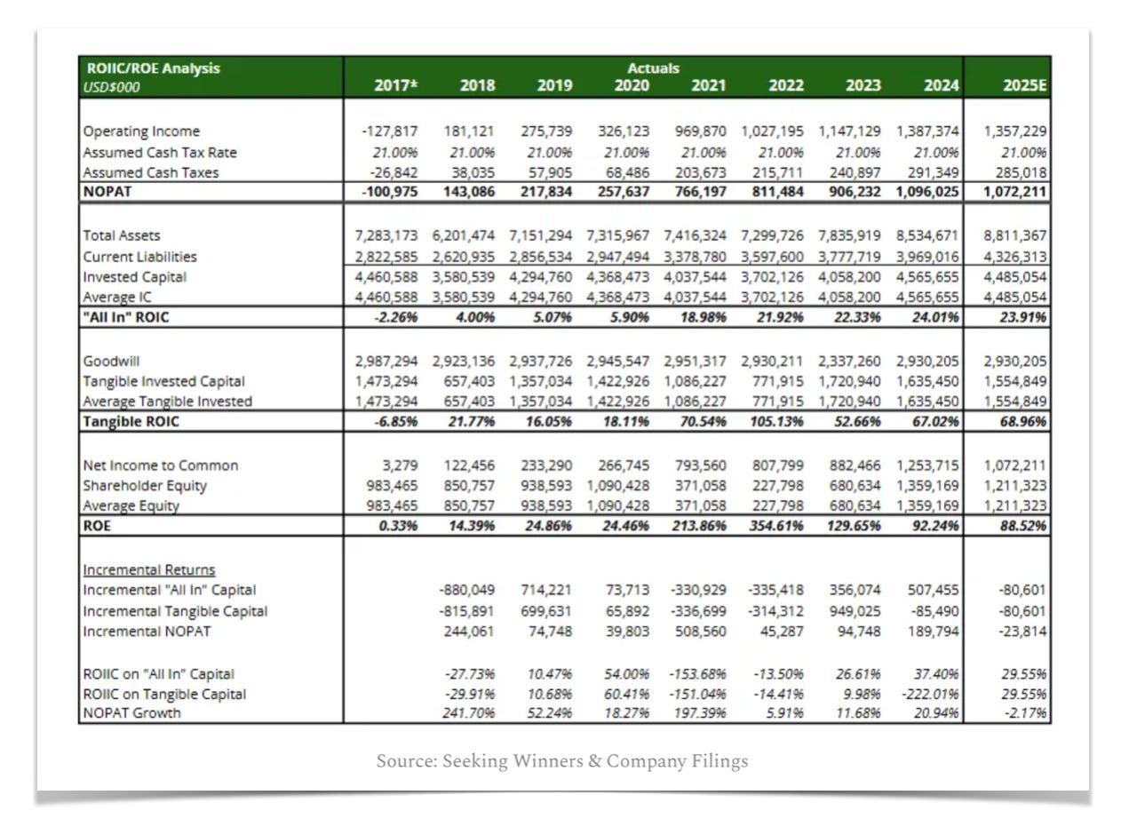 Its capital-light structure and favourable working capital, driven by upfront customer payments, result in consistently robust free cash flow, significantly exceeding net income typically by 140% due to deferred revenue. The company boasts outstanding returns on capital, with return on “All In” capital reaching 24% in 2024 and even better, ROIIC reaching 37.40% in 2024.